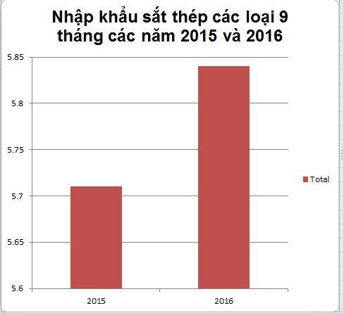 Thống kê của Tổng cục Hải quan cho biết, trong 9 tháng năm 2016, Việt Nam chi 5,84 tỷ USD nhập khẩu sắt thép các loại.