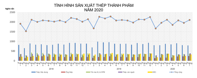 Tính chung 7 tháng đầu năm 2020 sản xuất thép các loại đạt hơn 13.728.271 tấn, giảm 6,9% so với cùng kỳ 2019.