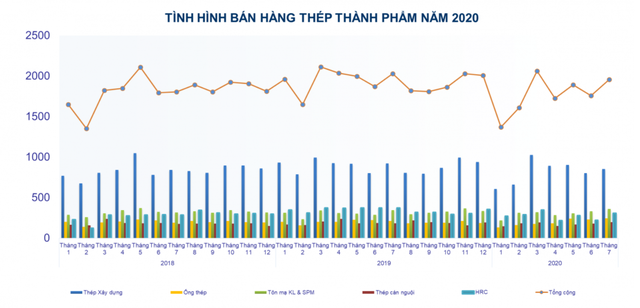 Bán hàng thép các loại đạt 1.955.784 tấn, tăng 11,25% so với tháng 6/2020, nhưng giảm 3,6% so với cùng kỳ 2019. Trong đó, xuất khẩu thép các loại đạt 424.734 tấn, tăng 41,37% so với tháng trước, và tăng 16,2% so với cùng kỳ tháng 7/2019.