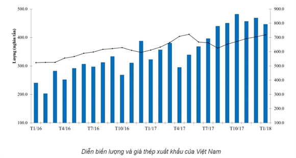 Về xuất khẩu, tính đến hết tháng 1/2018, xuất khẩu thép thành phẩm đạt hơn 446.000 tấn, với kim ngạch xuất khẩu đạt 321 triệu USD, tăng 38% về lượng, và tăng 63% về giá trị. ASEAN vẫn là thị trường xuất khẩu chính, với lượng xuất khẩu hơn 300.000 tấn thép, chiếm tới hơn 67% tổng lượng thép thành phẩm xuất khẩu. Tiếp đến là các thị trường Mỹ (11,28%), EU (5,07%), Đài Loan (3,42%), Hàn Quốc (3,15%).