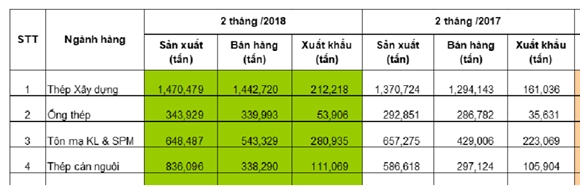 Trong tháng 2.2018, sản xuất sản phẩm thép các loại đạt 1.529.717 tấn, giảm 20% so với tháng trước, và tăng không đáng kể 0,7% so với cùng kỳ 2017. Bán hàng thép các loại trong nước đạt 1.350.986 tấn, giảm lần lượt 18% so với tháng 1/2018, và 5,3% so với cùng kỳ năm trước. Xuất khẩu thép các thành viên VSA đạt hơn 364.363 tấn, tăng hơn 36% so với cùng kỳ năm 2017.
