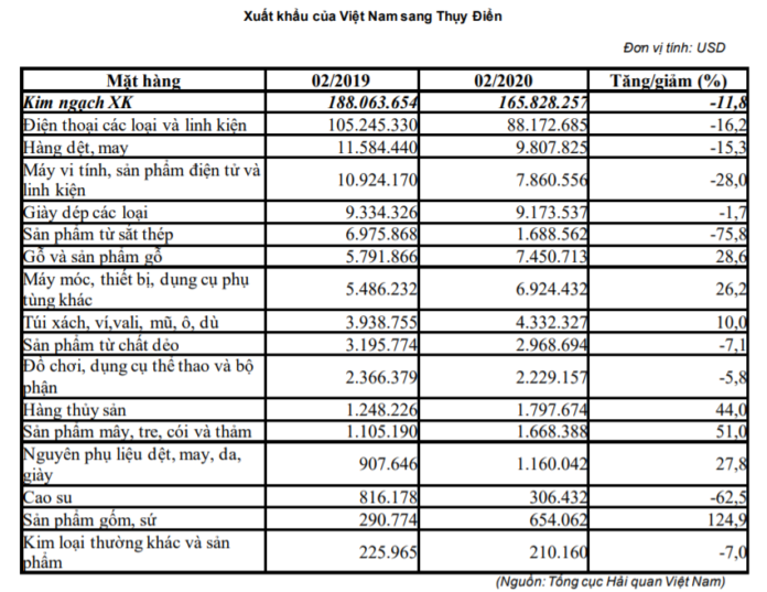 Về tình hình xuất khẩu, theo số liệu Tổng cục Hải quan, Việt Nam xuất khẩu sang Thụy Điển đạt 165,83 tỉ USD, giảm 11,8% so với cùng kì năm ngoái.