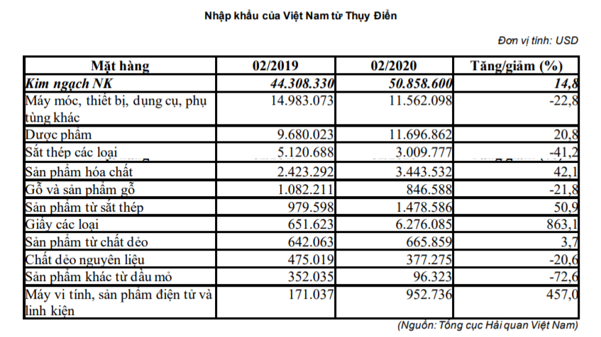 Về tình hình nhập khẩu, kim ngạch nhập khẩu của Việt Nam từ Thụy Điển đạt 50,86 triệu USD, tăng 14,8% so với cùng kì năm 2019.